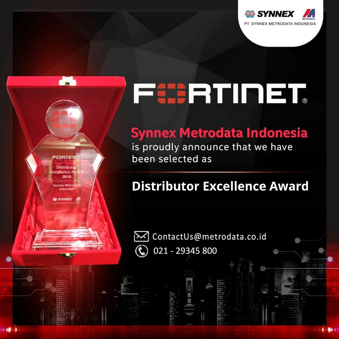 Synnex Metrodata Indonesia mendapatkan “Distributor Excellence” Award dari Fortinet. Award ini didapat atas hasil kinerja baik Synnex Metrodata Indonesia sepanjang 2019. Tidak hanya berfokus pada peningkatan revenue, Synnex Metrodata Indonesia terus membuka pasar untuk seluruh lini produk Fortinet di Indonesia.