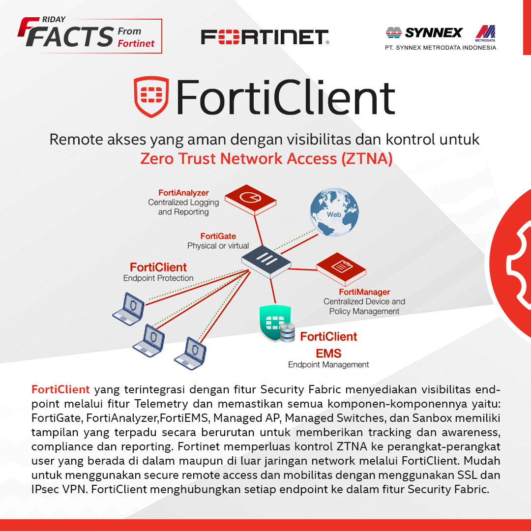 FortiClient yang terintegrasi dengan fitur Security Fabric menyediakan visibilitas endpoint melalui fitur Telemetry dan memastikan semua komponen – komponennya, yaitu : FortiGate, FortiAnalyzer, FortiEMS, Managed AP, Managed Switches, dan Sanbox memiliki tampilan yang terpadu secara berurutan untuk memberikan tracking dan awareness, compliance dan reporting. Fortinet memperluas kontrol ZTNA ke perangkat – perangkat user yang berada di dalam maupun di luar jaringan network melalui FortiClient. Mudah untuk menggunakan secure remote access dan mobilitas dengan menggunakan SSL dan IPsec VPN. FortiClient menghubungkan setiap endpoint ke dalam fitur Security Fabric.