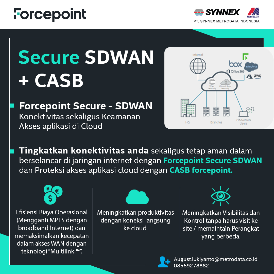 Jika perusahaan Anda menggunakan Salesforce, ServiceNow, Office365, Box, Dropbox, media sosial, dan sejenisnya dengan istilah masa kini Bring Your Own Apps (BYOApps) di sini CASB memiliki peran vital sebagai pencatat, auditor, perantara koneksi, filter, dan monitor infiltrasi/exfiltrasi dan ditambah dengan SDWAN untuk memaksimalkan konektivitas dan kecepatan akses WAN dengan teknologi trademark forcepoint – “Multilink”