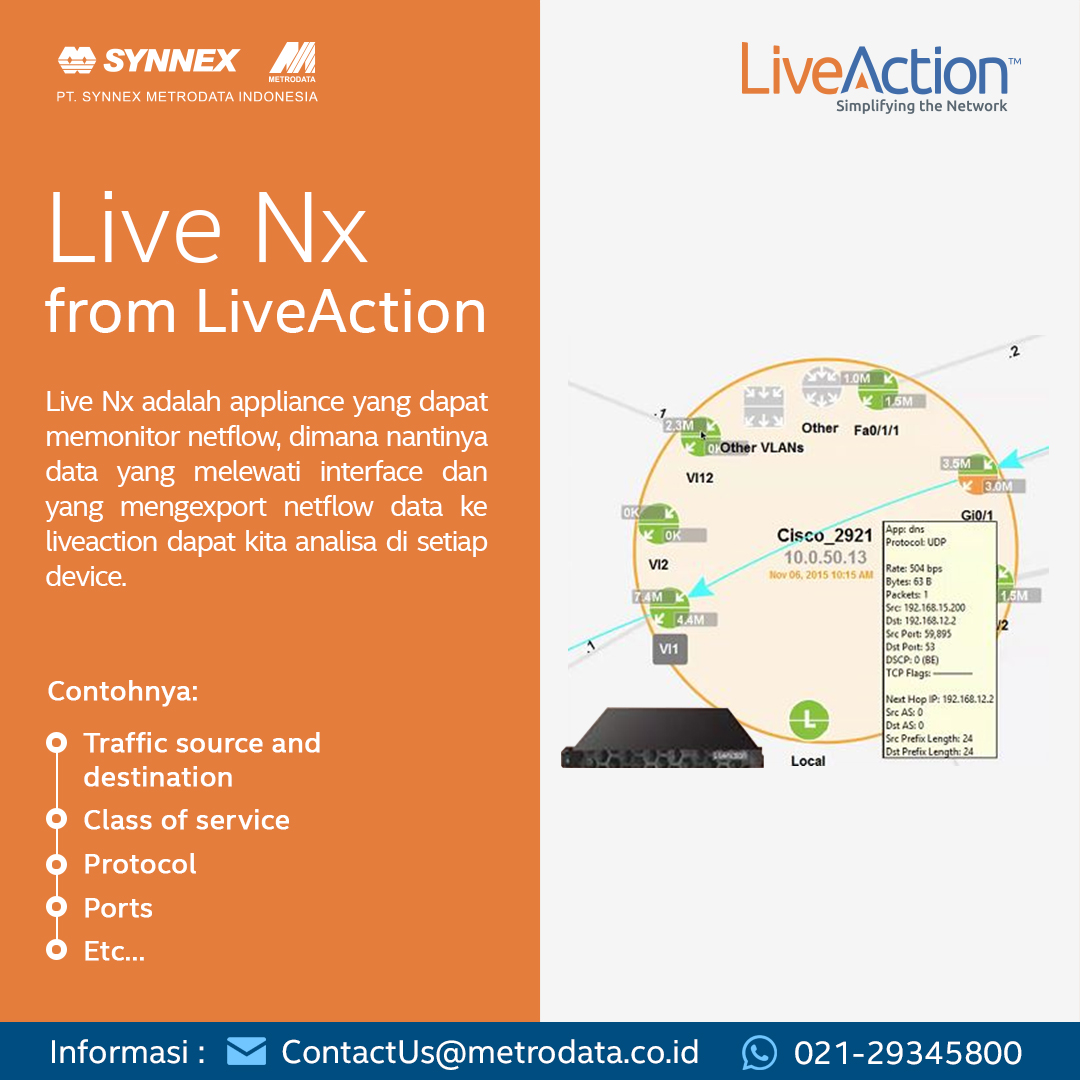Live Nx adalah software yang dapat memonitor traffic jaringan flow based (netflow, jflow, sflow, etc) termasuk SNMP, dimana nantinya traffic yang melewati interface dan yang mengexport flow data ke Liveaction dapat kita analisa secara intuitif di setiap device.
